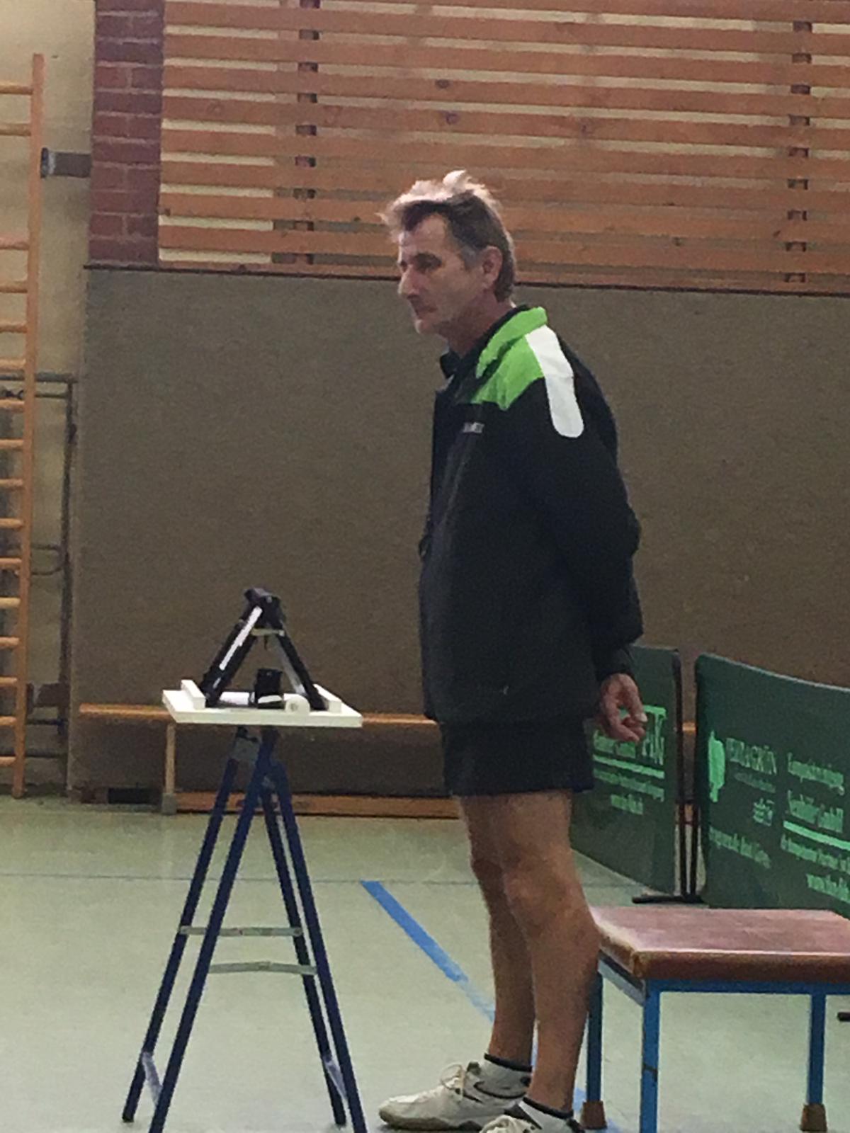 Weiter ging es mit den Einzeln! Ludwig stellte sich seinem Kontrahenten Anders, der es ihm sehr schwer machte und durch sein sicheres Spiel klar 3:0 gewann. Engelhardt dagegen hatte mal wieder Kampfgeist bewiesen. Sie gab den 1. Satz ab, aber hat ihre Lehren daraus gezogen und kämpfte um jeden Punkt mit vollem Einsatz. Dies wurde mit einem 3:1-Sieg dann folgerichtig belohnt. In der nächsten Runde des Spiels war das hintere Paarkreuz gefragt. Der als Ersatz spielende Wolf hatte ein schweres Los gegen Schmidt gezogen. Alles sah schon früh nach einer Niederlage aus, doch Wolf kämpfte und kämpfte und konnte seinen Rückstand von 0:2 auf 2:2 aufholen. Wie es dann bei einem solchen Krimi üblich ist, stand es im 5. Satz 10:10! Die Nerven lagen blank! Nach einer Spielunterbrechung durch den Kollegen Usbeck sammelte Schmidt sich noch einmal und konnte durch List seinen Gegner Wolf täuschen, der sich dann leider geschlagen geben musste (2:3). An Platte 2 hingegen lief Rudloff wie auch schon im Doppel in Topform auf. Mit seinem schnellen Topspinspiel und schnittvollen Aufschlägen ließ er nichts anbrennen und siegte klar 3:0. Somit stand es nach der ersten Runde 4:2.